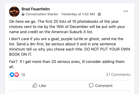 IN EARLY DECEMBER Australian photobook collector and maker Bill Purvis and AMERICAN SUBURB X managing editor Brad Feuerhelm initiated what turned out to be two lengthy online thread discussions on the FlakPhoto Books Facebook page about the end of year ‘BEST PHOTOBOOK’ lists. Topics included: the value or otherwise of lists, who makes the lists or to whom should we give the authority to make them, the gatekeepers and those amazing books that may be missed above those that didn’t deserve a mention.